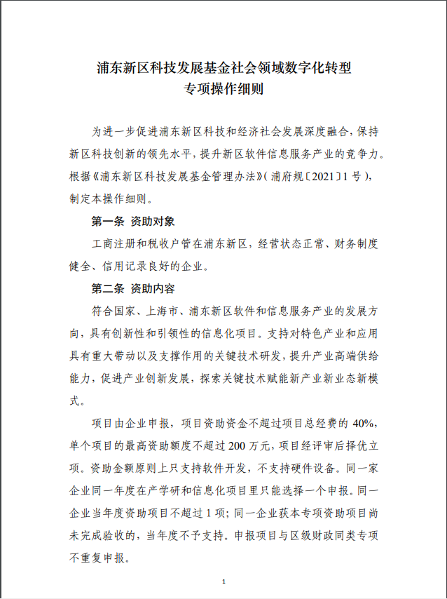 浦東新區(qū)科技發(fā)展基金社會領(lǐng)域數(shù)字化轉(zhuǎn)型專項操作細則