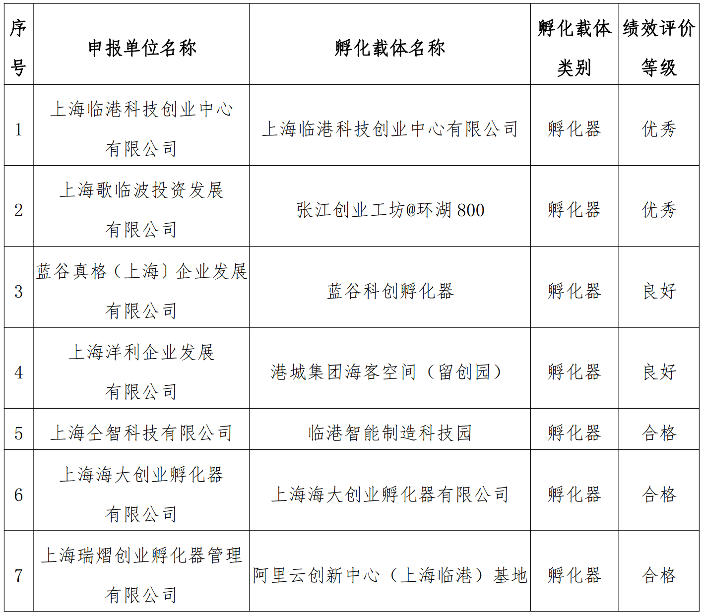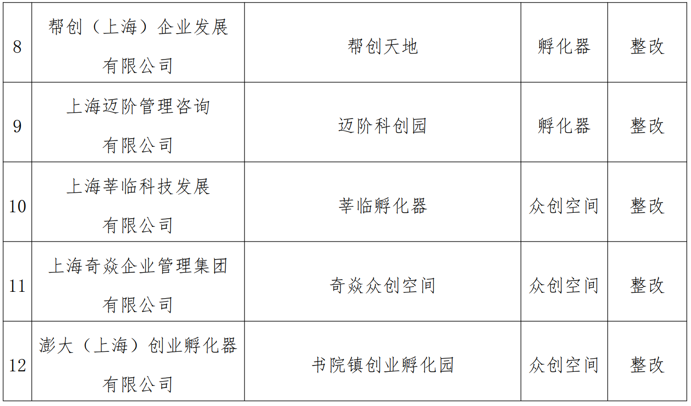 “上海臨港科技創(chuàng)業(yè)中心有限公司”(上海臨港科技創(chuàng)業(yè)中心有限公司)等2 家科技企業(yè)孵化器評(píng)估結(jié)果為“優(yōu)秀”,“藍(lán)谷科創(chuàng)孵化器”(藍(lán)谷真格(上海)企業(yè)發(fā)展有限公司)等2 家科技企業(yè)孵化器評(píng)估結(jié)果為“良好”,“臨港智能制造科技園”(上海仝智科技有限公司)等3 家科技企業(yè)孵化器評(píng)估結(jié)果為“合格”,“幫創(chuàng)天地”(幫創(chuàng)(上海)企業(yè)發(fā)展有限公司)等2 家科技企業(yè)孵化器評(píng)估結(jié)果為“整改”,“莘臨孵化器”(上海莘臨科技發(fā)展有限公司)等3 家眾創(chuàng)空間評(píng)估結(jié)果為“整改”。
