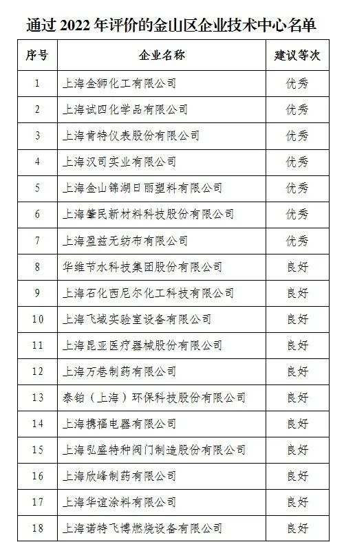 金山區(qū)2022年區(qū)級企業(yè)技術(shù)中心評價結(jié)果的公示