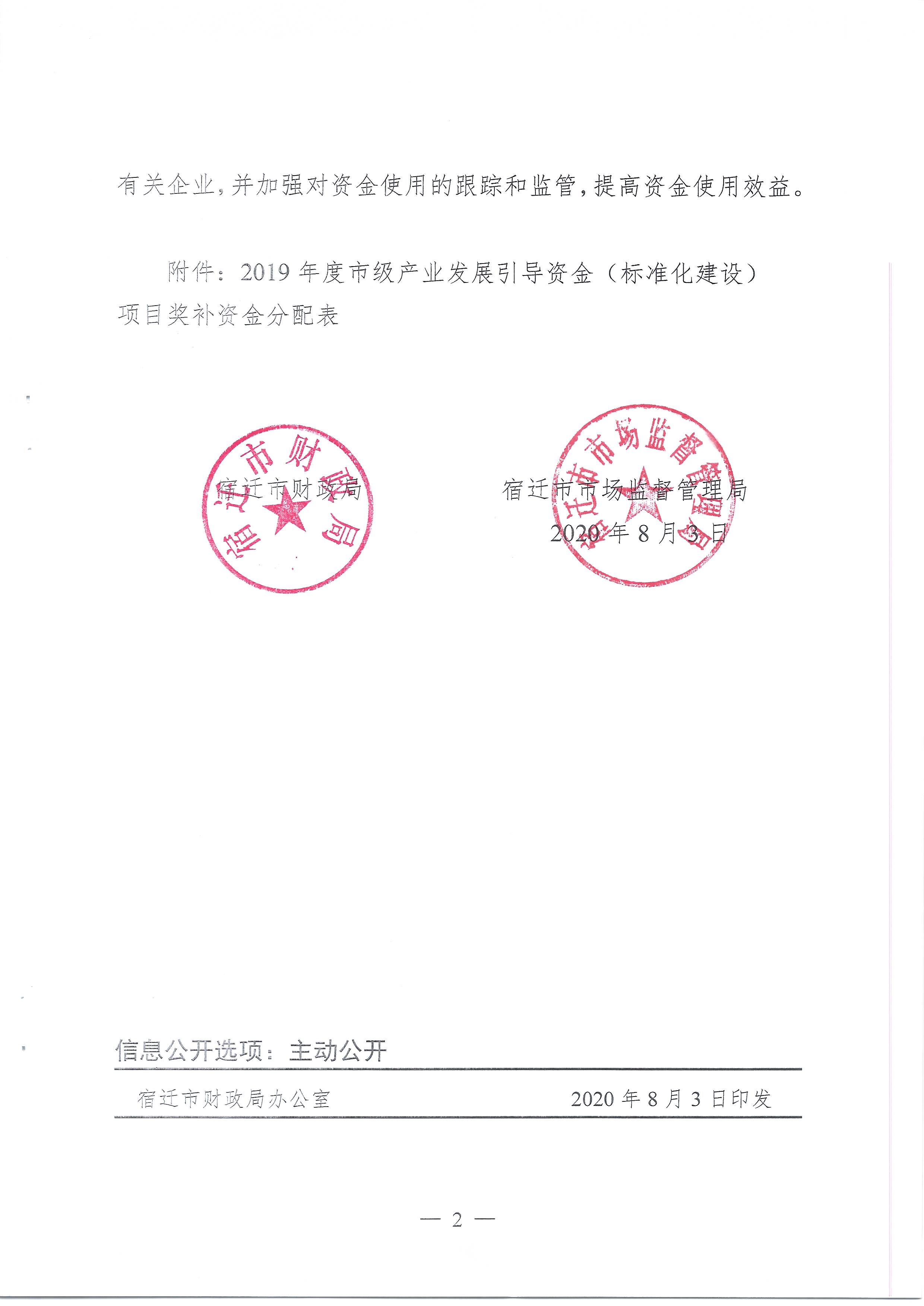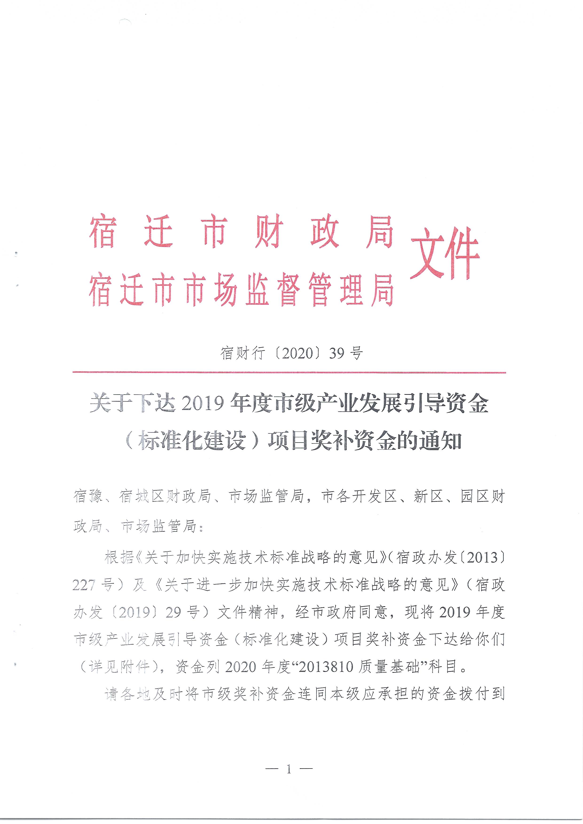 宿遷市關于下達2019年度市級產(chǎn)業(yè)發(fā)展引導資金(標準化建設)項目獎補資金的通知